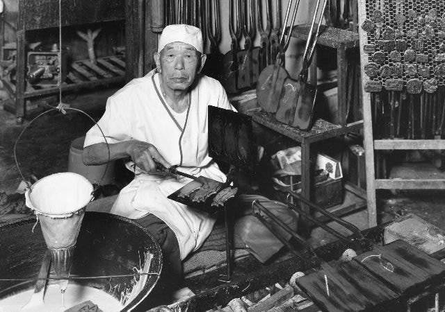 初代 亮三は、10代でせんべいの本場神戸で修業を積み、1等職人として腕を磨きました。